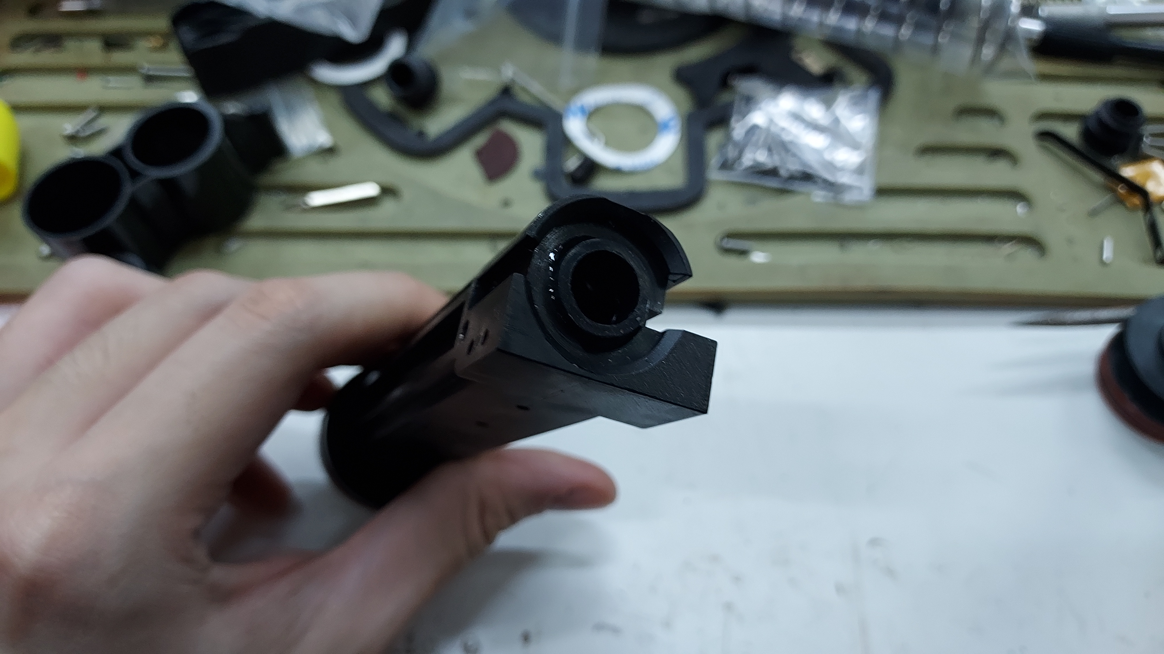 We shall start with the breech adaptor. The breech adaptor can be installed by lightly prying the receiver shell open and placing the breech adaptor into the holes at the front end of the receiver shell.